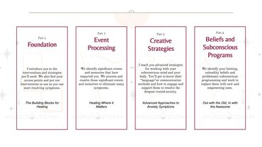 2) Each time we meet 1-on-1, I'll guide you through proven processes to reduce the distress and fear associated with your problem. (This is always present even when it doesn't seem apparent.)